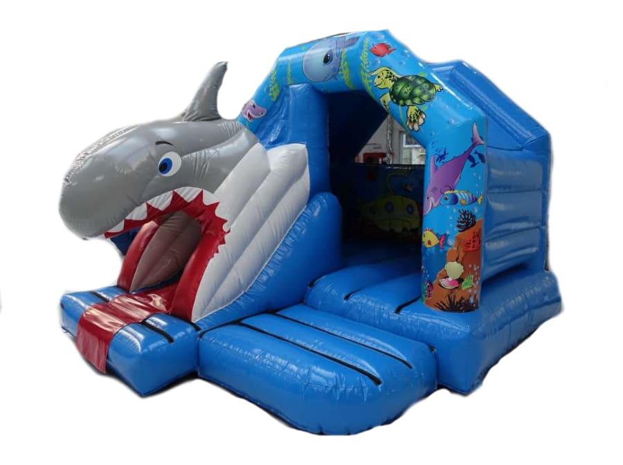 Our 12ft x 15ft Shark Slide Bouncy Castle Combo is a medium size castles in our range.